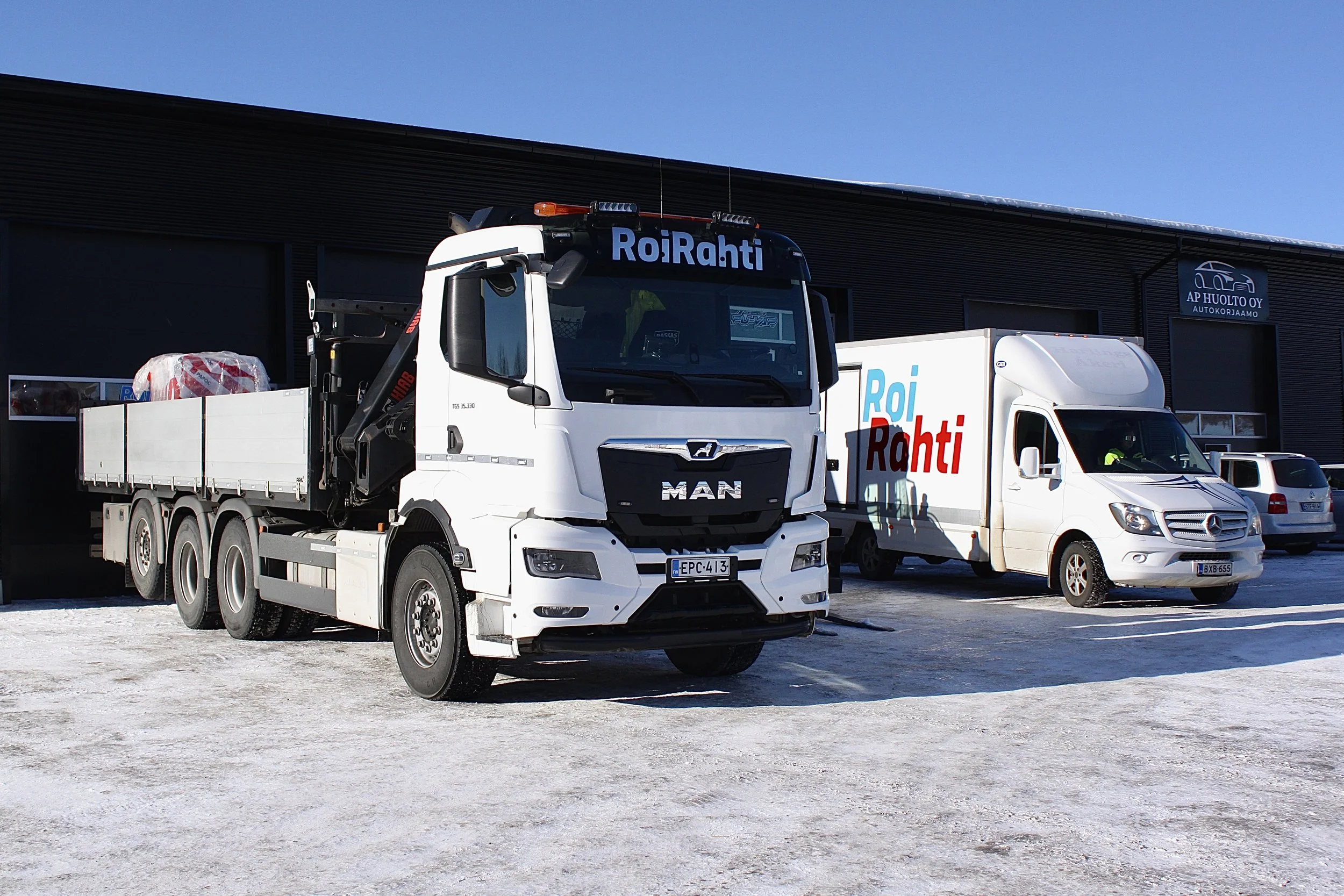 Kattava palvelu: Nosturiauto mahdollistaa monipuoliset nostotyöt, ja pyöräkoneella sujuu vaativampikin kuormanpurku nopeasti ja turvallisesti.